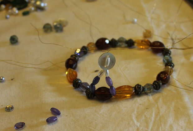 Ahora comencé a trabajar en el medio-mi tiara, es una idea para mantener razonablemente tensa el cable y puede lograrlo en su diseño por ciertos puntos de fijación, tal como lo hice con un botón pearlised la tecla. Sin embargo, sólo girando los dos cables juntos también puede mantener su diseño en el lugar.