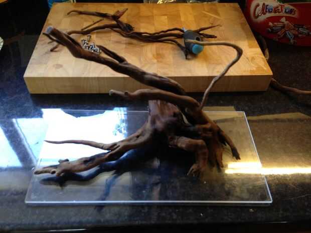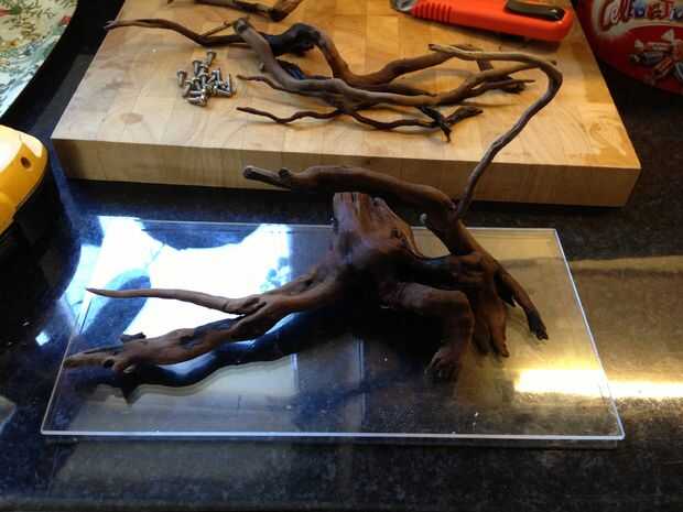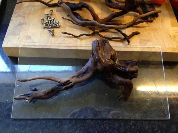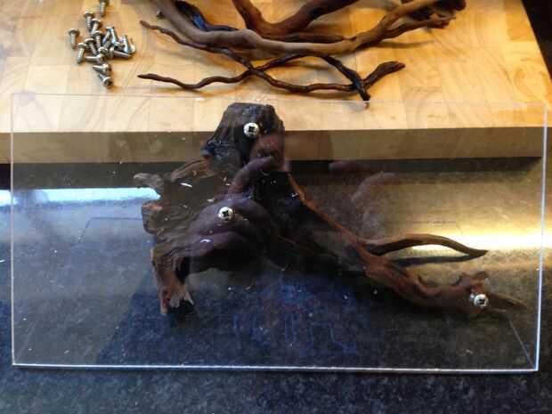 Cuando estés feliz con lo que aparece el siguiente paso es montarlo en el plexiglás. Fije los pedazos más grandes en primer lugar con los tornillos luego jam los pedacitos más pequeños en los huecos pequeños. Incluso puede perforar en pedacitos grandes y palillo las pequeñas ramas en los agujeros. Básicamente todo lo necesario para mantenerlo en su lugar.