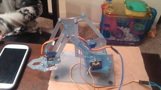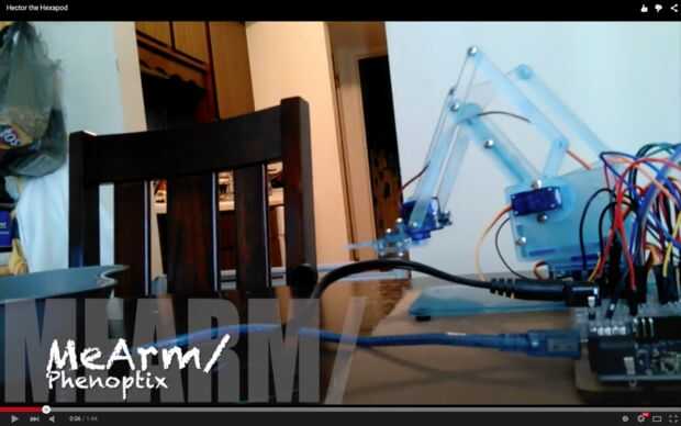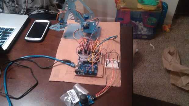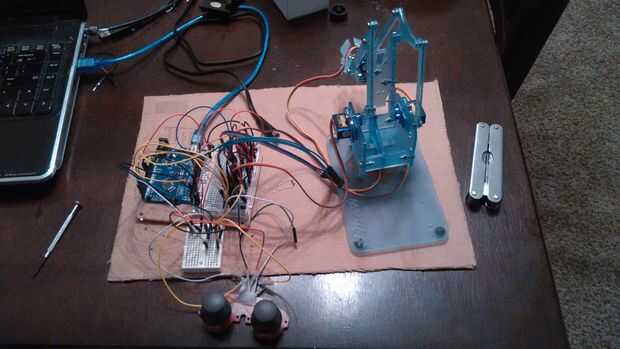 Este fue un divertido construir y vale $55 por sí mismo. Me quebró un viejo usb gamepad para encontrar las palancas de mando y había conectado el servo directamente a través de Arduino con ningún escudo que es por qué hay tanto caos en el protoboard. 4 E/S analógicas y 4 puertos PWM Digital son necesarios para el control de la MeArm con palancas de mando.