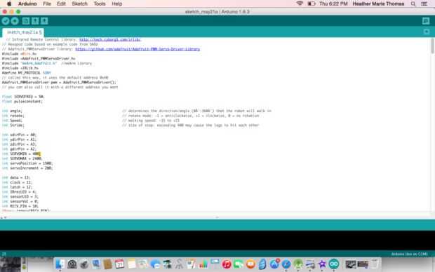 El código para el control de los movimientos hexápodos se basa en el código de ejemplo de Dagu con modificaciones realizadas para el uso a través del escudo de Servo de Adafruit. Este enlace conduce al código que controla sólo el hexápodo.