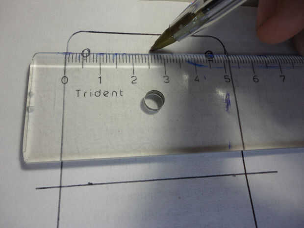 -En las diagonales del cuadrado medida hacia fuera de 10 m m del círculo y márquelo. Es donde se perforarán el agujero del tornillo.
