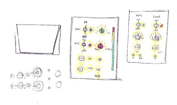 -Me decido a colocar los controles en una forma que se asemeja al dibujo de la izquierda en los estudios, pero sin el botón de distorsión y dial y gráfico de barras.