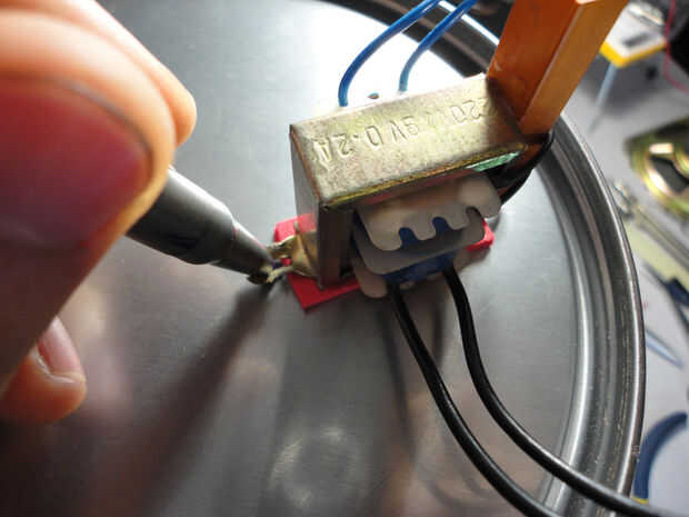 Por último, el transformador se fija a la placa inferior del barril, así que marqué para perforar usando la parte de sí mismo como plantilla.