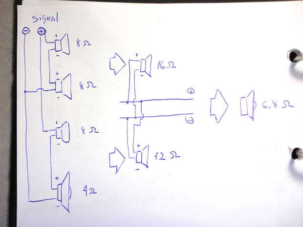 -Combinación de serie y paralelo de cableado puede alcanzar más una impedancia a 8 ohmios originalmente impulsado por la amp. Compruebe la foto 1 para ver lo que me di cuenta, y que cheque osgeld de instructable para dominar ese empalme en línea muy útil!