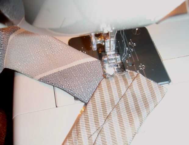 Ahora para la diversión parte. Coser la correa próxima al pedazo de que grapas al bastidor. Tienes que tener la máquina de coser cerca así que usted puede seguir añadiendo las correas a medida que avanza. Set correas de lazo en un ángulo de 90 grados y luego coser en un ángulo de 45 grados a través de las correas. ¿Ver en la segunda foto? Cose hacia adelante y hacia atrás 2 o 3 veces. Luego clip el triángulo pequeño y voila! Un pedazo más largo. Nota: los lados de la frente de los lazos se cosen juntos. No puedo decirte cuántas veces he tenido que volver a coser...