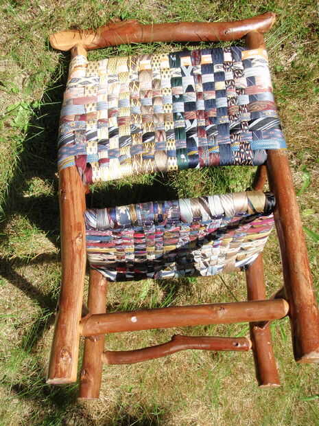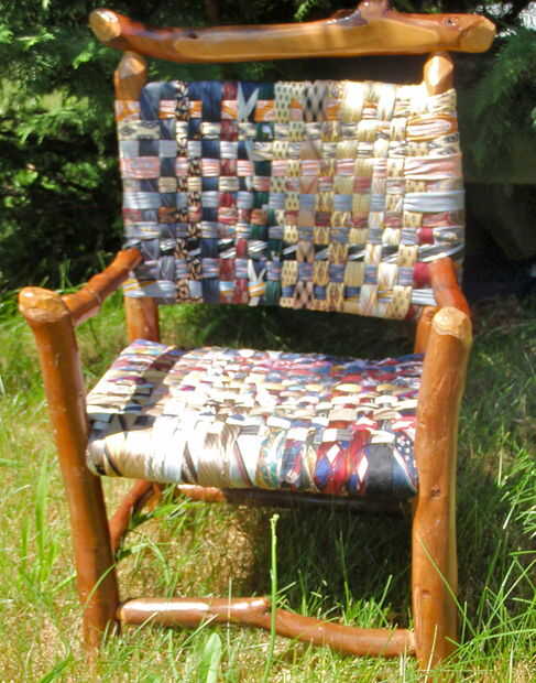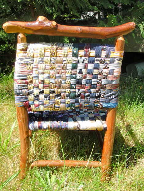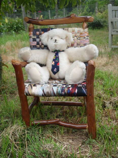 Esta silla tiene un patrón de tablero de ajedrez, alternando oro y azul. Alguna vez no te un patrón exacto con corbatas a menos que utilizas todos los colores sólidos pero me gusta este efecto. El oso fue hecho por un amigo. Hice la corbata.