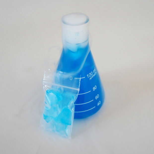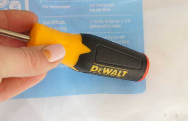 A continuación, utilice la parte posterior de un destornillador para romper la bolsa de hielo seco en pequeñas virutas mientras que es inmóvil i la bolsa. Coloque un paño pesado debajo de ella. La apertura para el vaso es muy pequeña, entonces las virutas del hielo tienen que ser pequeño **. Uso de palillos a plop suavemente los trocitos de hielo en el vaso.