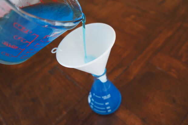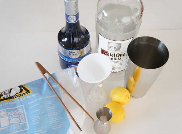 Exprimir el jugo de dos limones en una coctelera. Agregar el Vodka, Blue Curacao y hielo le dan una buena sacudida! A continuación, cuele la mezcla cocktail en una taza de medir. Ponga un embudo de tamaño apropiado en el vaso de mini. Vierta el líquido en el vaso.
