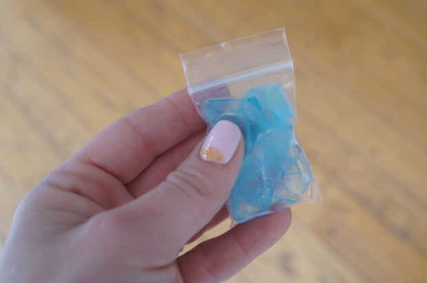 Opcional: Como efecto añadido, usé un poco de gel azul cielo que había añadido al agua y se lo congeló. Me aplastó con la parte posterior de un destornillador y había agregado a una bolsa de plástico pequeña.