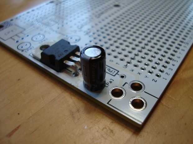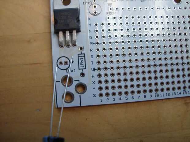 Añadir el diodo. Observe que hay una franja blanca en un lado. Este lado debe ir en el agujero cuadrado, o el circuito no funcionará! Lo de la soldadura y recorte las patas.