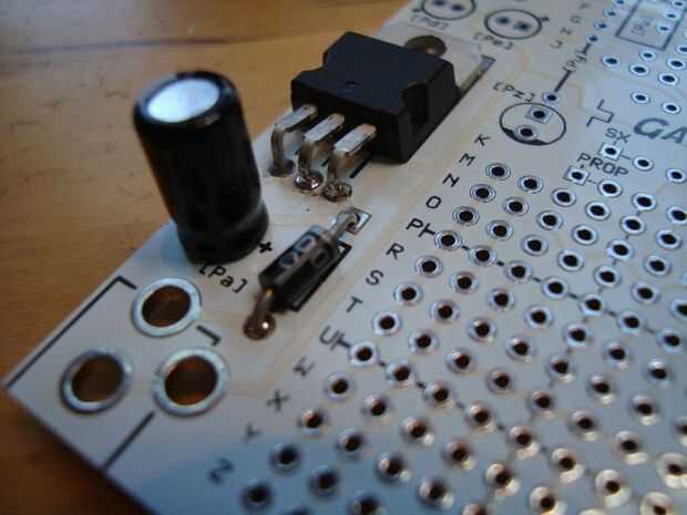 Encontrar el condensador de 100uF e introducirlos en los agujeros marcados [Pa]. Tenga en cuenta que la pierna más larga va en el agujero con el + junto a él. Lo de la soldadura y recorte las patas.