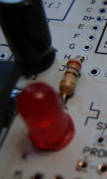 Un LED va a PZ. Asegúrese de poner la pata larga en el agujero cuadrado en la parte superior y el lado plano del LED más lejos lejos de la resistencia (véase el cuadro).