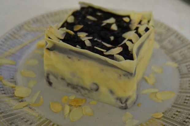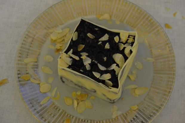 Este postre lo tiene todo: envoltura crujiente de chocolate y almendras, helado cremoso relleno cubierto con una salsa de frutas baya!
