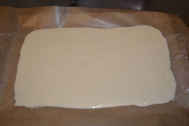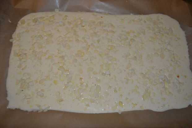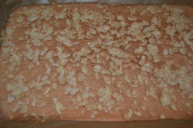 línea una bandeja de horno con papel de horno y extender la esponja en la bandeja a un rectángulo del tamaño de unos 18 cm x 36 cm. Espolvorear masa uniformemente la parte superior con la mitad de las almendras fileteadas.