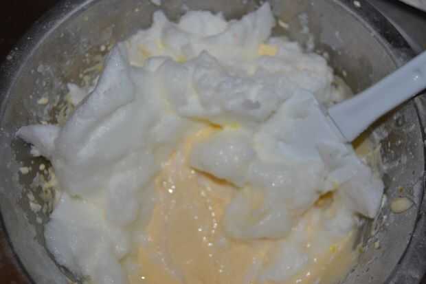 en otro bol, poner las claras de huevo y una pizca de sal y bata hasta que muy tieso (Asegúrese de limpiar las varillas de batir, ya que ningún tipo de grasa en las varillas impedirá que las claras de huevo de la beoming stiff), luego doblar cuidadosamente las claras de huevo a la mezcla de yema de huevo.