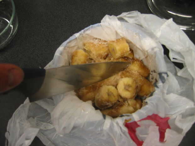 Apalanque el plátano uno por uno del bloque de banans congelados. Es más fácil de lo que cabría esperar.
