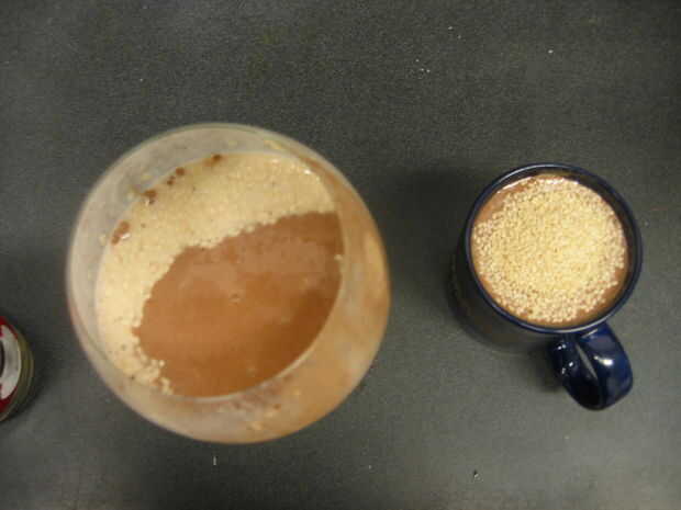 Aquí es un black-and-tan con un lote medio mezclado con cacao y el café sobre el básico, espolvoreado con semillas de sésamo. MMM bueno.
