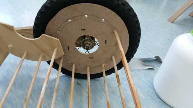Tiré de los neumáticos de una bicicleta que había encontrado en la basura y cortar un par de círculos sobre la mesa de fresadora de algunos MDF. No tomar ninguna foto de ese paso pero aquí es un corto video en YouTube para mostrar cómo si es necesario.