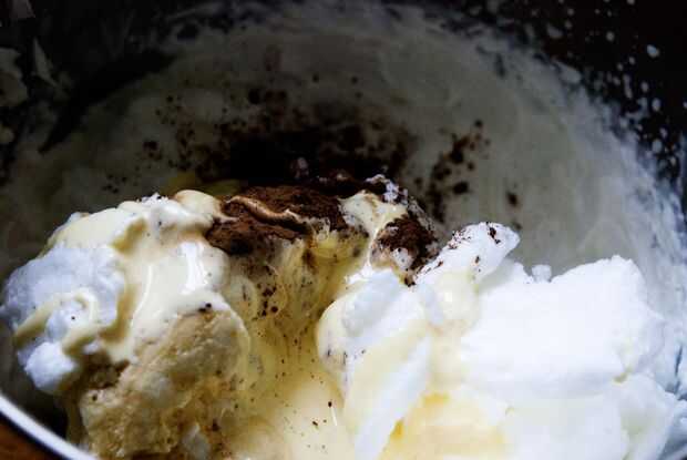 Combine la crema batida, blancos, crema de yemas, café y polvo de café instantáneo. Suavemente doblar todos los ingredientes hasta obtener una crema.