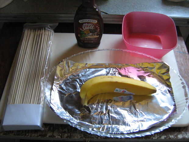 cosas que usted necesitará:1. fresas2. plátanos3. chocolate4. un pote grande5. una olla pequeña6. palitos dePaso 1: Cortar fruta 1 cortar los plátanos por la mitad2. colocar paletas en extremo plano de plátanos3 limpiar fresas y cortar tapasPaso 2: D