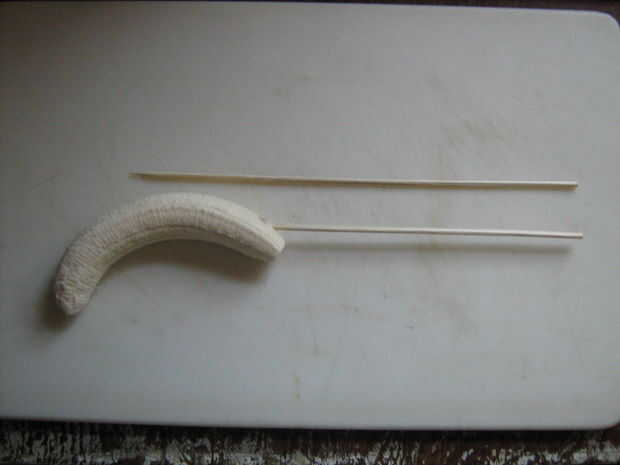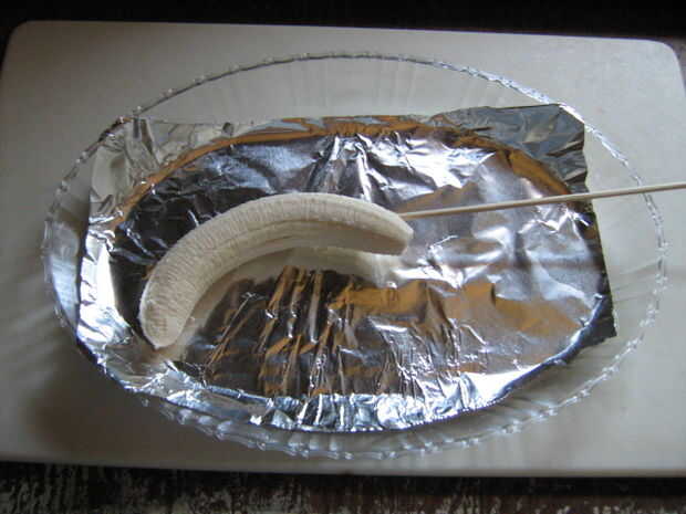 Entonces querrás insertar el pincho cerca de dos tercios de la manera en la banana (mi derecho uno se rompió por la mitad dentro de la cáscara, así que tuve que conseguir un reemplazo, no muy recto). Utilizo otro pincho para juzgar aproximadamente Dónde está la punta.