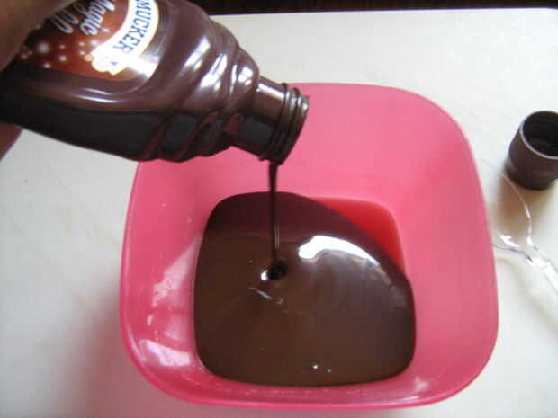 Cuando es casi tiempo para llevarlos a cabo, vierta su concha de chocolate en el tazón de fuente y tiene una cuchara lista. No olvide agitar/mezcla el chocolate, porque si es casera o almacenar compró, contiene aceite, y cosas que contienen aceite de separan en el tiempo si se trata de tocados.