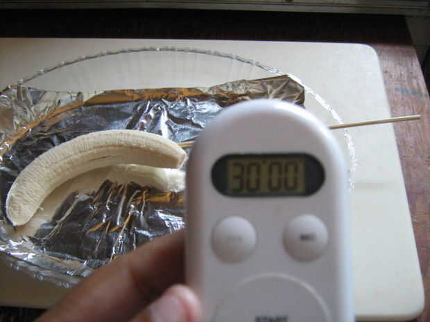 Poner las bananas en el congelador durante unos treinta minutos o hasta que casi congelado. Que no desea congelado sólido, sólo lo suficientemente fríos como para que se endurezca el chocolate más tarde.