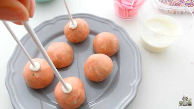 Una vez que has formado las bolas, derretir algunos del caramelo derretido. Sumerja el palillo del lollipop 1/2 pulgada en el candy melt y empuje la mitad en la bola de la torta. Para mejores primicias, no aplica este paso.