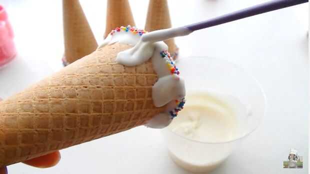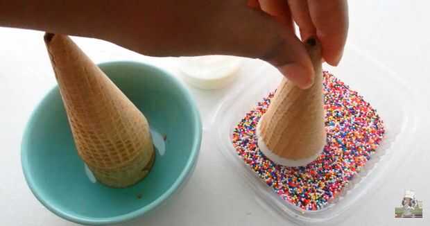 Mientras que son creación de esas bolas de pastel, jazz hasta los conos de helado sumergiendo el borde en caramelo se derrite. Que exceso caída hacia el caramelo derretir luego sumérjalos en confeti dulce o Granillo.