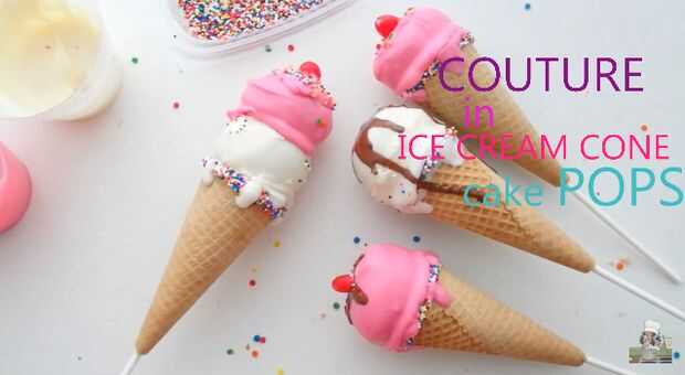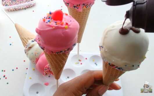 Mientras que mojado, superior de los conos de pastel con chispas y todo tipo de dulces. También corté una haba de jalea roja por la mitad como una cereza. Para la mirada del helado, añadir algunos derritieron el chocolate y dejar que goteo hacia abajo.