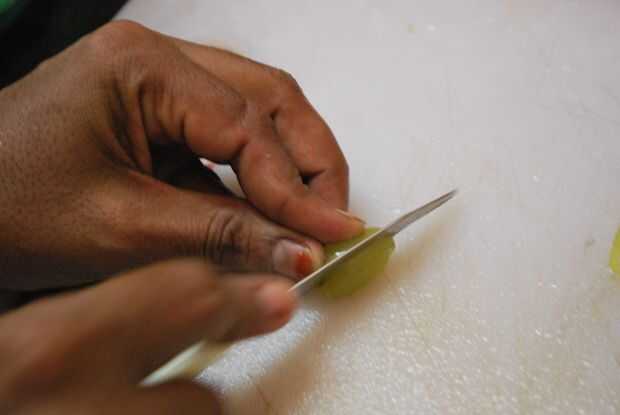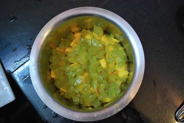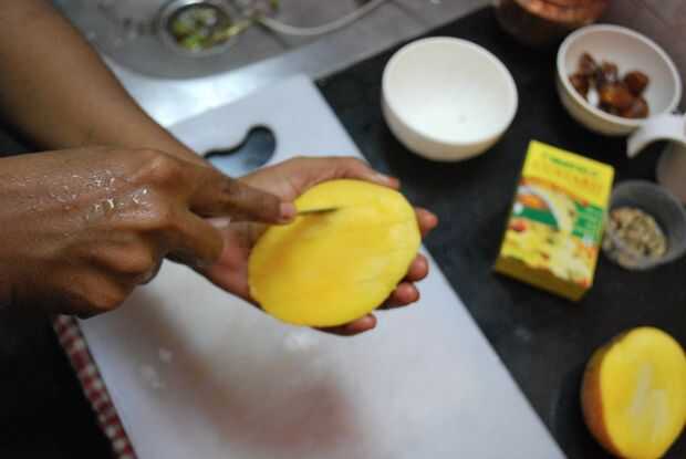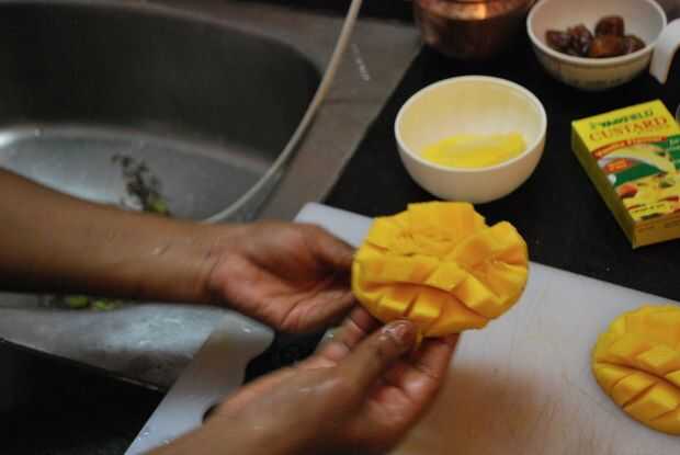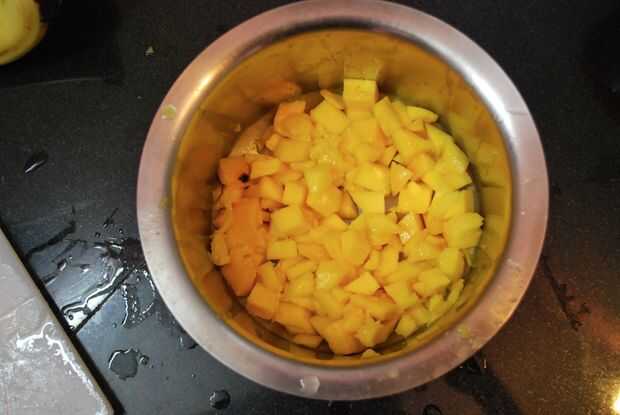 Comience cortando la fruta en trozos pequeños. Se ve bien dejar la fruta en capas, pero en nuestro caso, consiguieron mezclado bastante cuando agregamos la mezcla de crema y leche.