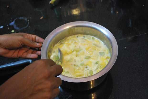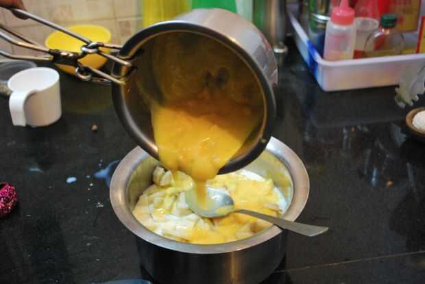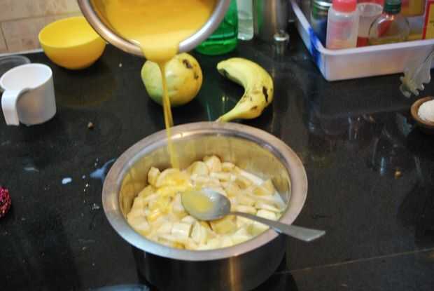 Después de unos minutos de calentamiento Vierta la mezcla de flan sobre la fruta picada.