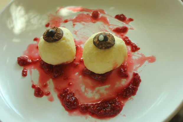 Me encanta hacer helados pero esta idea para un postre macabro puede hacerse fácilmente con helado store-bought y puedes ir a ciudad iris crazy color caramelo y todo tipo de salsas y jarabes para la 'sangre'. Crema de ojos puede ser comida lenta o rápida fiesta, la elección es suya.