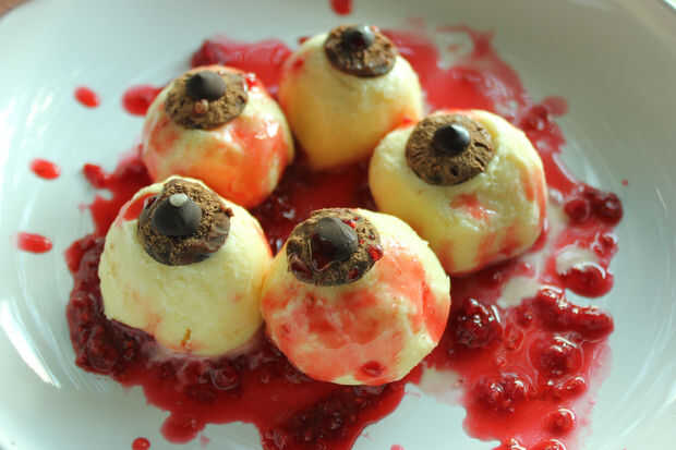 La 'sangre' esta vez manchada en un plato frío también dejó el helado de la fusión. También agregamos más salsa por encima de las bolas de ojo para que sea incluso gorier!