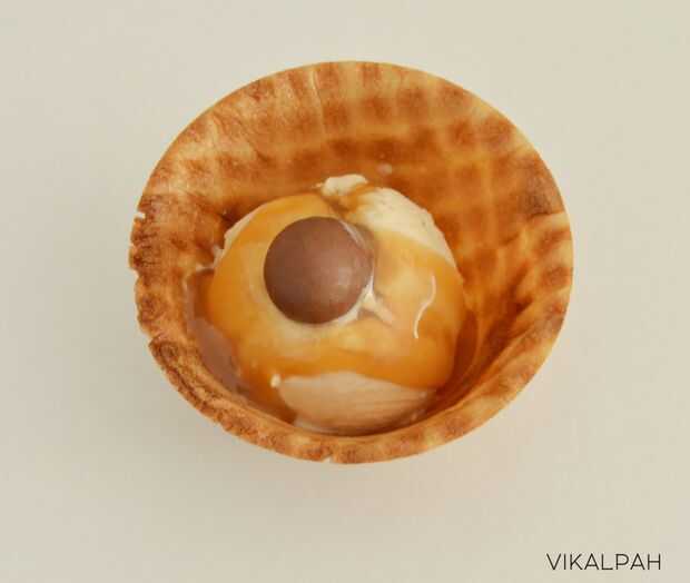 Recipiente comestible, jarabe de caramelo y trocitos de chocolate.