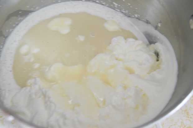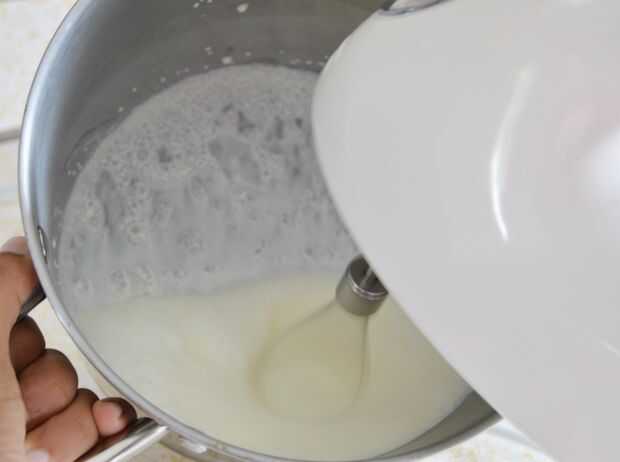 • Tomar media pinta de crema de leche en el vaso grande y empezar a batir hasta que formen picos. Esto puede tomar un tiempo. Puede ser alrededor de 4 a 5 minutos.
