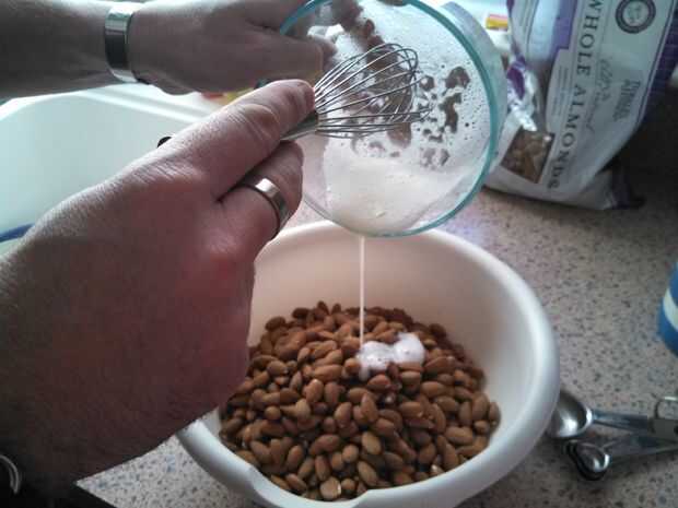 Usted quiere asegurarse de que cada almendra está cubierta en la clara del huevo.