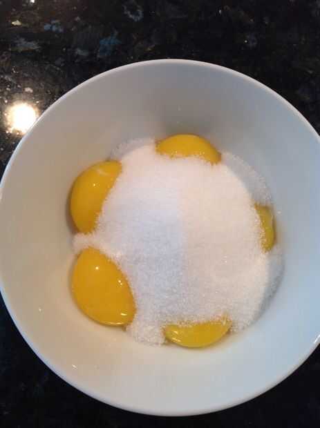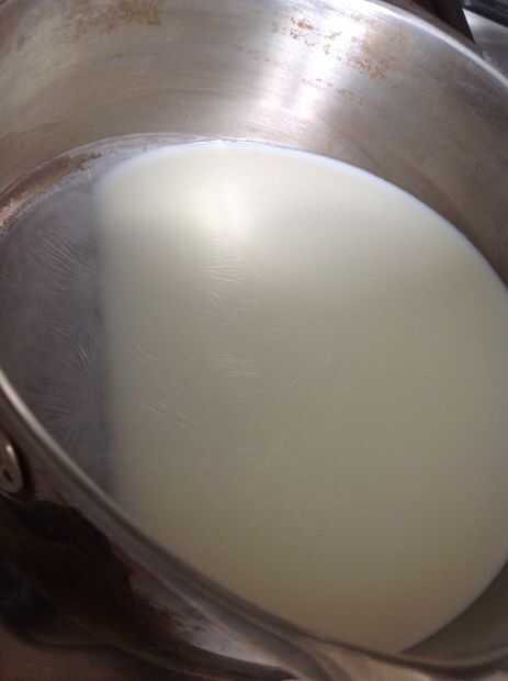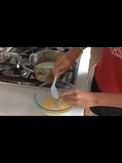 1. comenzar por batir las yemas y el azúcar juntos hasta que se tornen de un color amarillo pálido. En el mismo tiempo calor la leche y la crema en una cacerola a fuego lento, revolviendo ocasionalmente. Una vez que usted nota que la mezcla de leche y crema ha formado una capa ligera de "piel" como en el tercer cuadro, sacar el calor.