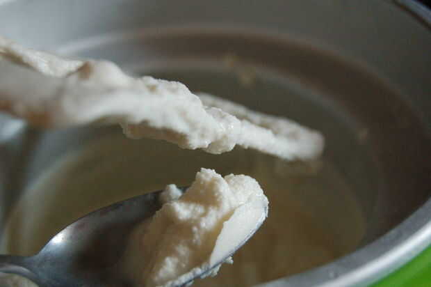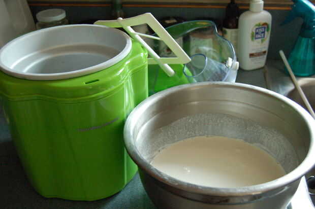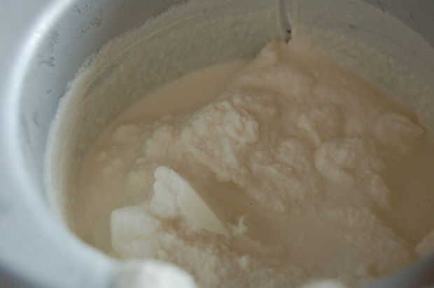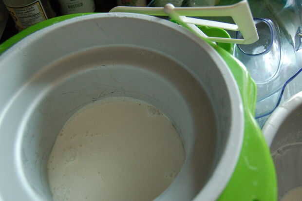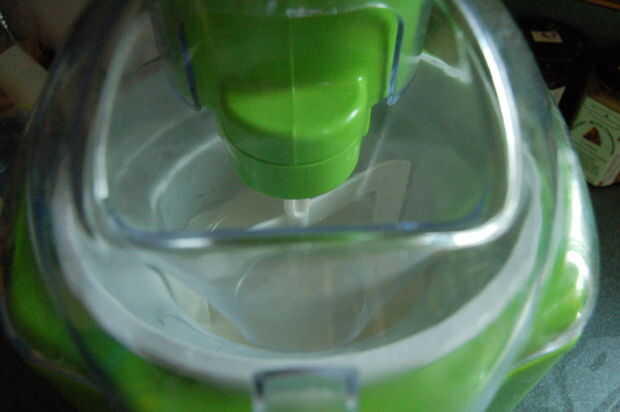 Una vez que tu mezcla está lista, verter en la heladora. Asegúrese de que su frasco congelado está completamente congelado. Yo incluso congeló mía un par de días antes, sólo para asegurarse. Ahora encienda la máquina y ajustar un temporizador de 10 minutos. Si la mezcla no se ve como los dos últimos cuadros después de 10 minutos, luego hacerlo para otros 10 pero mira para que no congele demasiado.