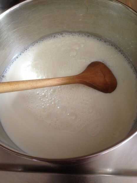 Calentar la leche y el azúcar en una cacerola sobre fuego lento y revuelva hasta que el azúcar se disuelva, pero no permita que hierva. Es importante que el azúcar se disuelva completamente removiendo a fuego directo, sin disolver cristales dan una textura granulada a mezclas congeladas. Agregar esencia de vainilla