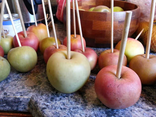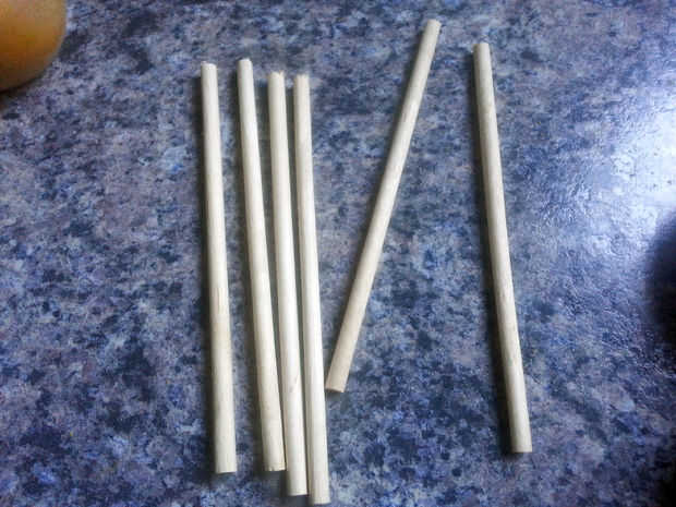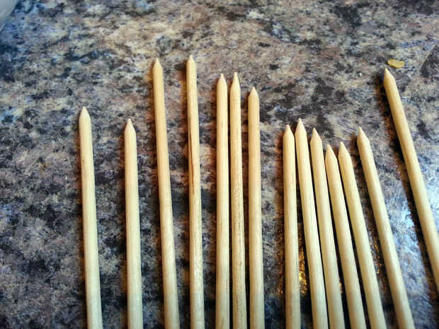 Usaba tacos desde el almacén del dólar, pero cualquier palo robusto de su elección será probablemente también a estar bien. Afilé con un sacapuntas para que sea más fácil pegarlas en las manzanas, pero no era 100% necesario. Utilizar sus palos puntiagudos para atravesar las manzanas, un sacrificio a la exquisitez.