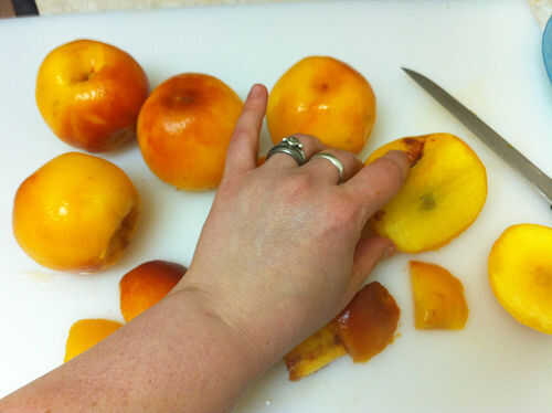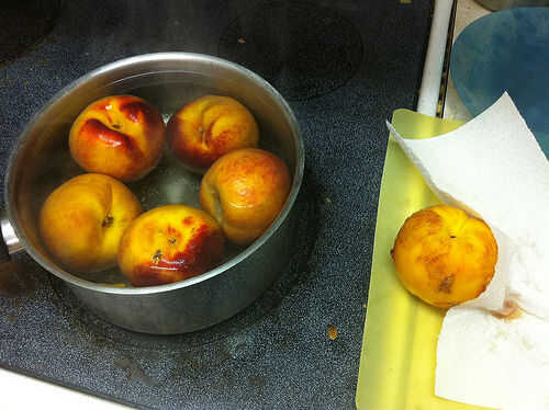 Encontrar la forma más fácil de pelar un melocotón es blanquearlo. Poner una olla de agua a hervir. Caída de los melocotones en y hervir por unos minutos. Quitar un melocotón con pinzas y limpie la piel con una toalla o toalla de papel. Si viene lejos fácilmente, está listo. Retire la olla del fuego y frotar la piel de los melocotones.