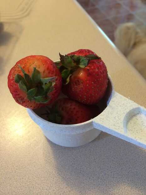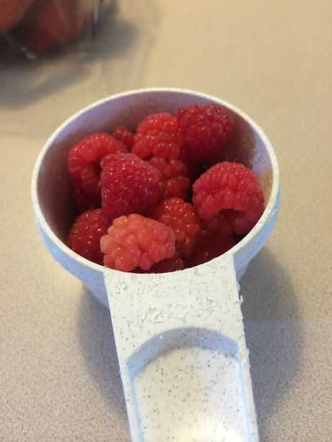 Medida 1/2 una taza de frambuesas y fresas luego ponerlas en cuencos desesperada