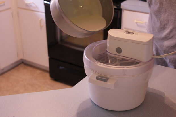 Para mi máquina tomó el tazón de fuente del congelador, lo y nos dispusimos a añadir la natilla. Agregar la crema, habíamos almacenado en el refrigerador hace unas horas, permite la máquina revolver la natilla durante 20 minutos (10 minutos en una dirección y a 10 minutos en la otra dirección). Cuando el temporizador tomé mi helado y había transferido a un recipiente de plástico. Se derramé las fresas hechas puré mezclar uniformemente.