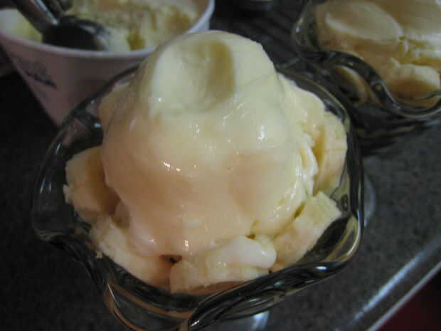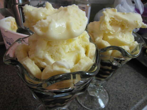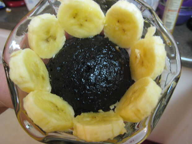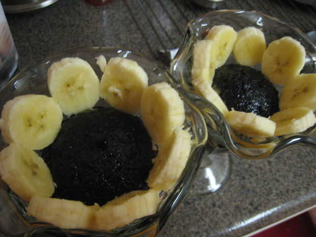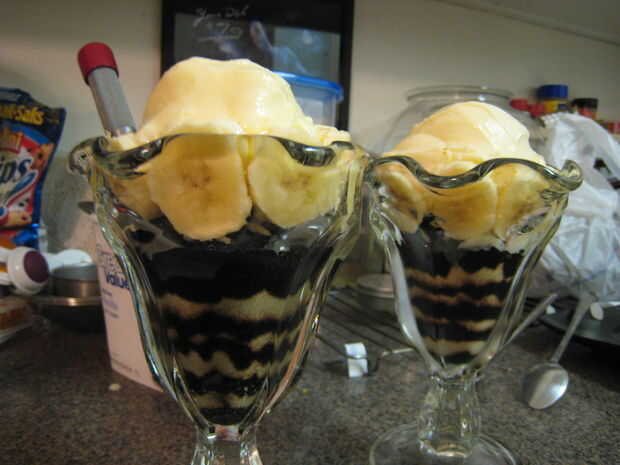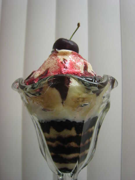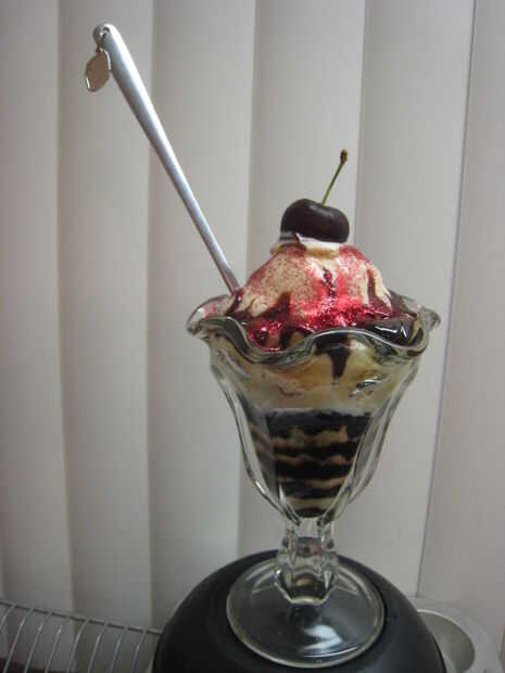 Corté a un plátano, que trabajó para ambas copas, colocar alrededor del borde superior, interno del vidrio frío, muy elegante! Luego tomó una bola de helado de vainilla y utilizar mi dedo para que se vea más suave y redondo. He hecho una abolladura del dedo en la parte superior, de la cereza se siente bastante. Antes de la cereza, salpicar con el chocolate (calentada en microondas, tarro de cristal). Entonces usé rojo brillo comestible sobre el chocolate y la cereza en la parte superior. Fue muy bonito ver, degustar buena y fue muy divertido para hacer.