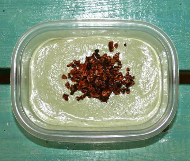 Primero debe remojar un puñado de semillas de cacao crudo durante la noche. Esto hará que el postre mucho más apetecible que las semillas son muy duras si no remojan. A continuación, picar para arriba algunos menta fresca hojas y mezcla en su base de anacardos sin congelar "helado" (utilicé las hojas de tallos de 2 para 1 taza) junto con una pizca de polvo de spirulina (es un verde más brillante.) Por último añadir tus semillas de cacao, remover y congelación.