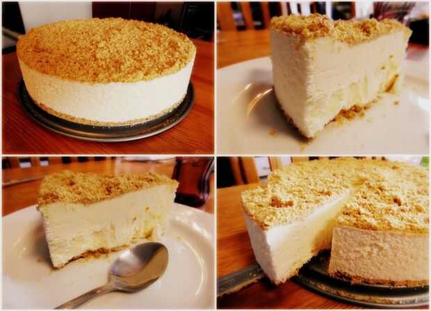 Tomar los aperitivos y triturar en pequeños trozos (migajas). Tomar la mitad de la miga y poner en el fondo de un molde con fondo removible. Pobre la masa en y poner el resto de él de migas en la parte superior.