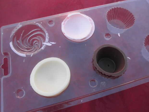 Lo primero que tienes que hacer es fundir el chocolate. Sus chocolates a media potencia en el microondas en 30 intervalos de segundos revolviendo con frecuencia hasta fundido y cremoso. No deje que el agua entre en contacto con el chocolate (Asegúrese de que el recipiente está seco antes de poner el chocolate) poner el chocolate derretido en el molde hasta la línea, a continuación, ponga la parte superior del molde sobre el chocolate. Esto desplazará el chocolate para que su producto final será un pastelito de chocolate hueco para poner el helado. Golpéelo suavemente para conseguir las burbujas de aire, luego se voltea y golpee otra vez. Enfriar en la nevera por unos 15 minutos y luego ponga en el congelador por unos 10 minutos. El chocolate debe sólo pop fuera del molde, pero suavemente. Si por alguna razón se rompe el chocolate, puede derretirse el chocolate y vuelva a intentarlo.
