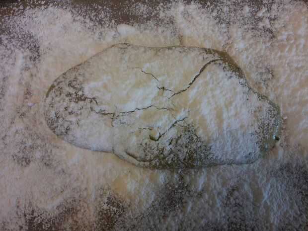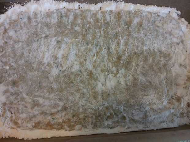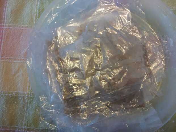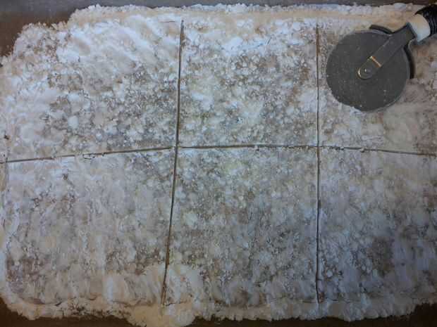 En una bandeja, espolvorear algunos almidón primero y ajustar la mezcla. Espolvorear almidón más encima y Esparza la mezcla para hacer el tamaño de la hoja de 8 x 12. Deja que se enfríe primero y ponerlo en el refrigerador durante una media hora más o menos. Corte la mezcla en 6. Polvo de exceso de almidón usando un pincel de repostería. En un plato de pastel, poner una bolsa de sándwich, entonces la hoja de mochi. Repita el proceso. Poner en el congelador durante media hora más o menos.