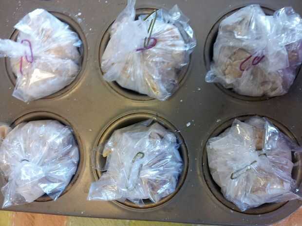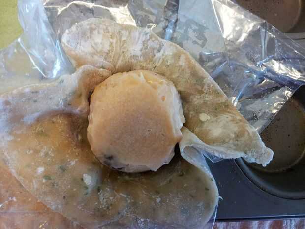 Sacar las hojas de mochi y las bolas de helado congelador. Tomar una hoja de mochi con una bolsa de sándwich y establecer una bola de helado en el centro de la hoja. Envuelva firmemente para arriba y el clip con un clip para papel para sellar. Poner la bola de helado envuelto en pan de mollete. Repita el proceso. Poner la bandeja en el congelador.